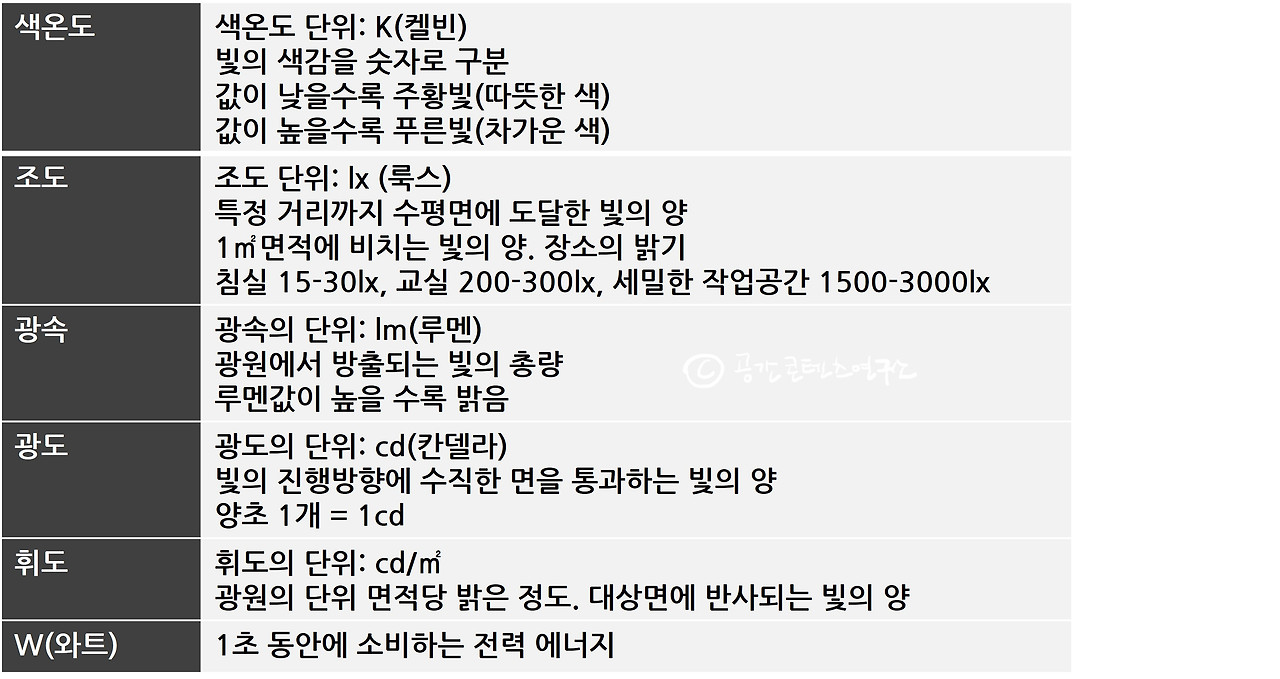 주로 많이 쓰이는 것은 lx(룩스, 조도)와 K(켈빈, 색온도) 정도이고, 조명도 전기기구의 하나이기 때문에 W(와트, 소비전력)도 많이 보게 됩니다.