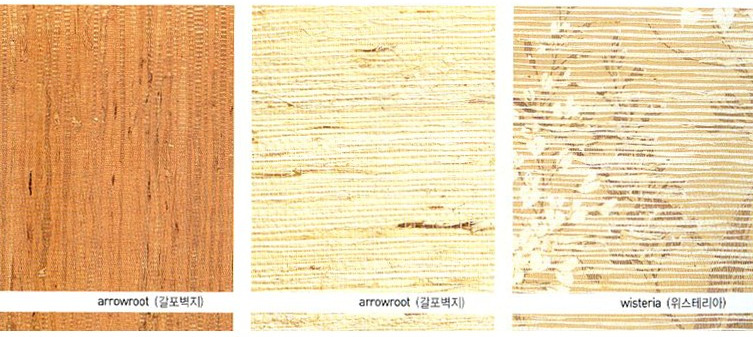 : 풀을 엮었다는 의미로, 우리나라는 전통적으로 갈포벽지(칡넝쿨)가 주종을 이루었고, 그 외에도 왕골을 이용한 완포, 완심벽지, 황마벽지(황마), 아바카 벽지(아바카) 등이 있음