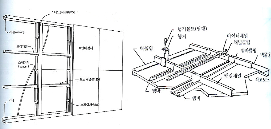 벽체 세우거나, 천장을 만들 때도 구조재로 금속재료를 사용합니다.