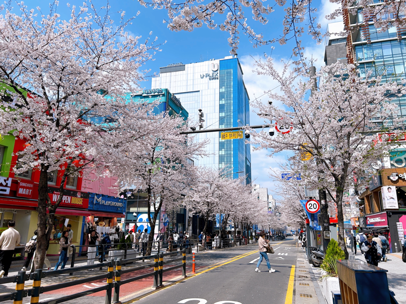 '뭐지?' 하고 고개를 돌리는 순간 만개한 벚꽃나무의 행렬이 눈에 들어온다.