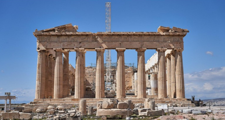 파르테논 신전의 정면은 8개의 거대한 기둥과 박공모양인 페디먼트 지붕으로 구성되어 있습니다.