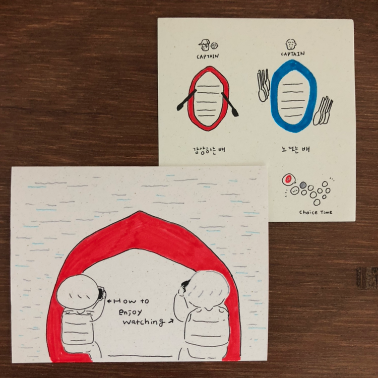 오늘의 래프팅은 내가 경험한 첫 래프팅보다 훨씬 더 안전했다. 보트를 저어주는 강사는 물결 같은 속도로 보트를 운전하며 주변에 보이는 것에 대해 설명해주었다. 강 위를 헤엄치는 연어와 물 위를 지나가는 뱀을 보았고 강가에서 자란 야생 사과를 맛보았다. 작지만 알찬 맛이었다. 강과 바다가 만나는 곳을 지나자 수면 위로 떠다니는 물개도 보였다. 보트운행을 멈추고 모두 내렸다. 버려진 섬 같은 곳을 밟자 부드러운 느낌이 들었다. 그곳은 물의 양에 따라 때때로 사라지고 바닷물을 머금고 있어 작물이 자라기는 어렵다고 했다. 그렇지만 잡초와 꽃들은 자라기도 했다. 멈춰 서서 땅에서 자라난 것들을 조용히 지켜본 후 다시 보트에 탔다. 래프팅은 바다의 경계에 완전히 도달했을 때 마쳤다. 우리는 박수를 치며 단체사진을 찍었다. 역시나 여행은 단체사진이다.
