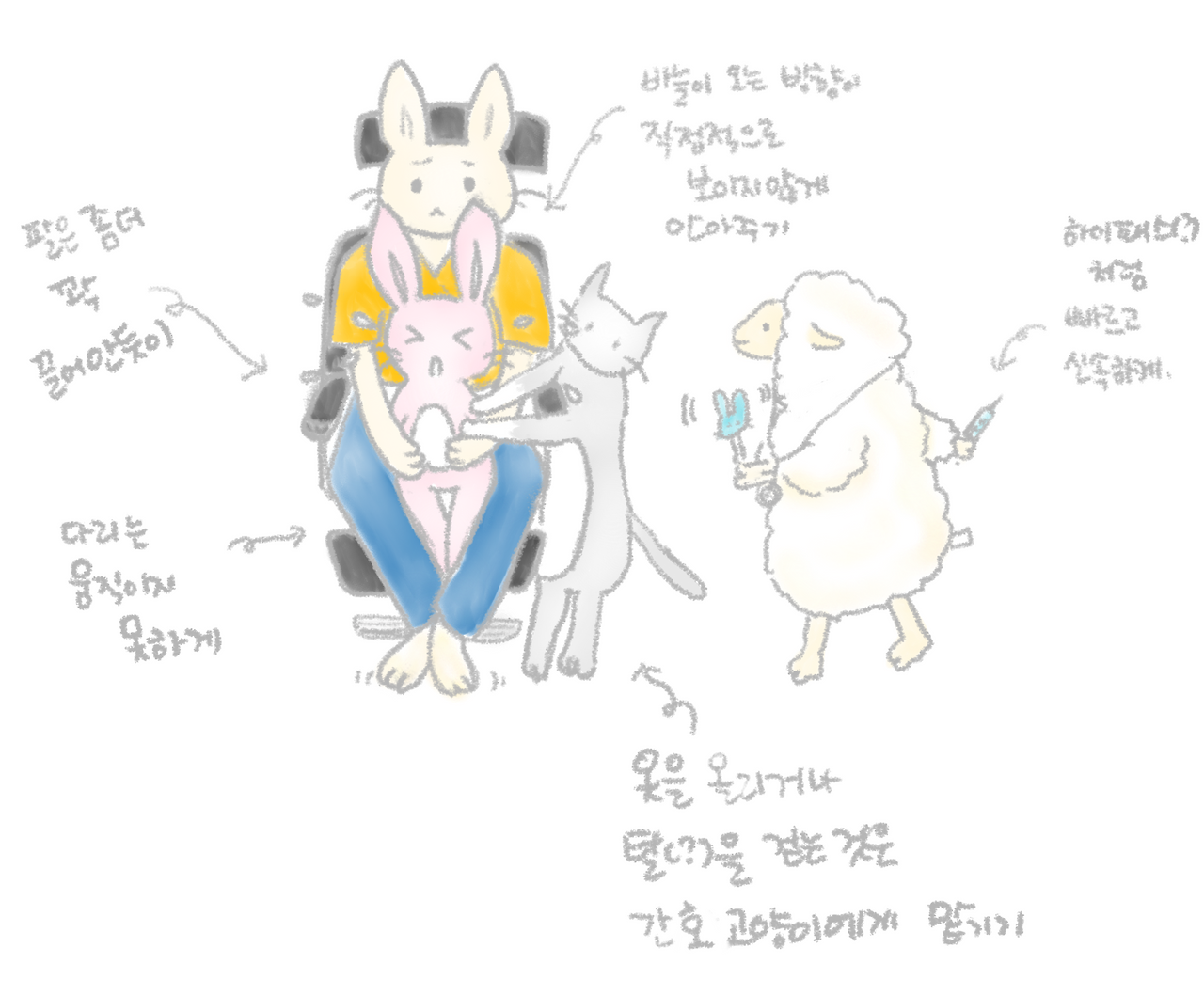 이 세 가지를 지키면, 죽음과도 같은 접종을 그나마 아주 조금이라도 쉽게 넘길 수 있을 것이라는 생각이 든다. 하지만 구슬픈 울음소리를 들을 때면, 나도 모르게 다시 죽음을 떠올리게 된다....