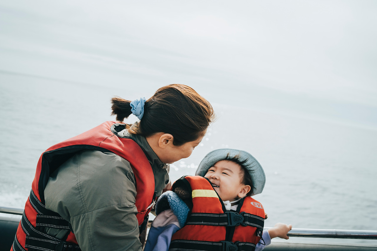행운은 찾아오지 않았지만, 아이와 함께 난 행운을 찾아 나서기로 했다. 포구에서 구명조끼를 착용하고 간단한 주의 사항을 듣고는 배에 앉았고, 배는 꽤 빠른 속도로 바다를 갈랐다. 시원한 바람과 함께 시간이 흐를수록 실제로 고래를 마주할 수 있을 것이란 기대로 내 가슴은 속절없이 쿵쾅거리기 시작했다. 그리고 얼마나 달렸을까? 이내 배의 엔진이 꺼지고 선장이 바다를 향해 손가락질한다.