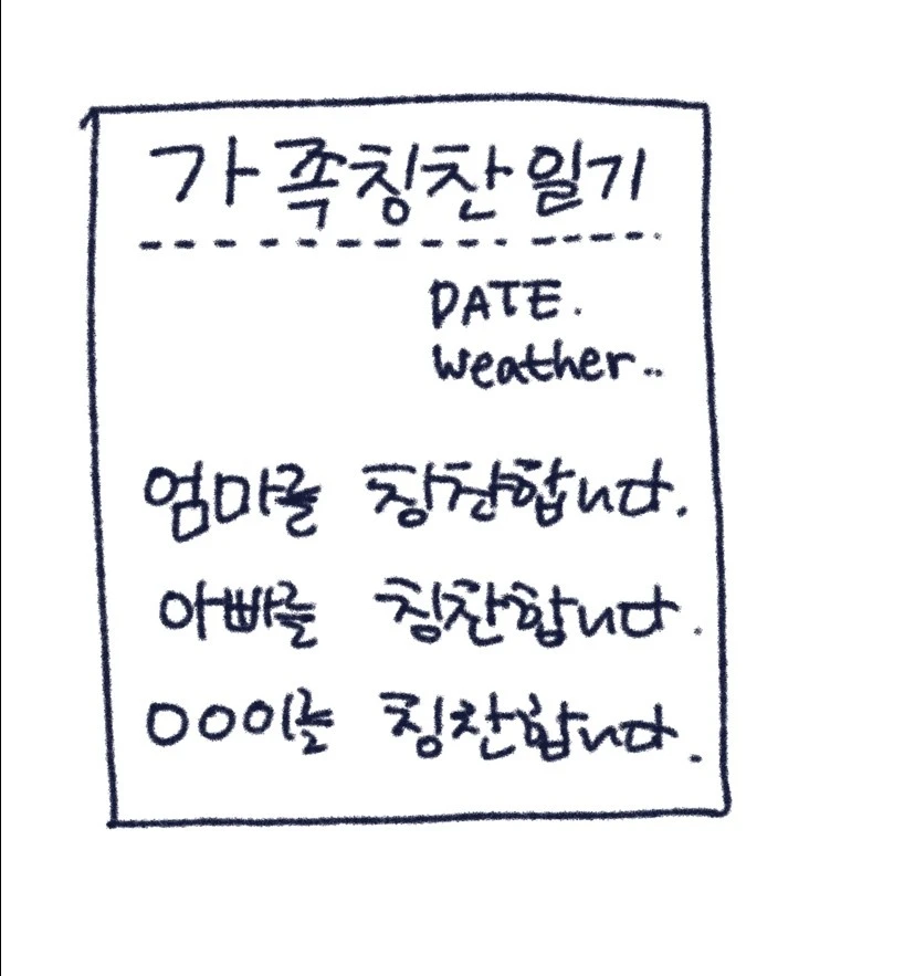 가족들이 돌아가며 쓰는 칭찬일기를 쓴다