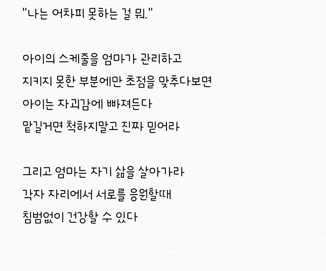 아이의 작은 발걸음 한 발 한발에 박수와 지지를 보내줄 수 있는 엄마이기를.