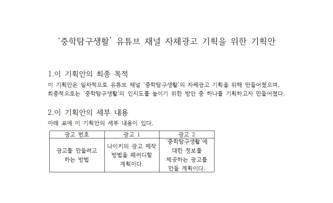 제가 운영하는 유튜브 채널 자체 광고기획안입니다.아이가 말로 중얼거리며 아이디어가 있다고 하길래 제가 써보라고 했어요