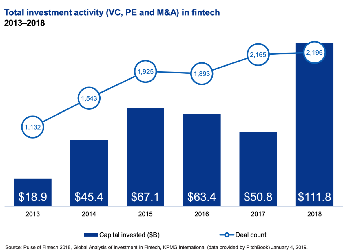 지난 5년 사이 벤쳐 캐피탈과 인수 합병을 통해 핀테크로 흘러들어간 금액은 10배가 늘었다. 작년 한 해 만 1118억달러다.