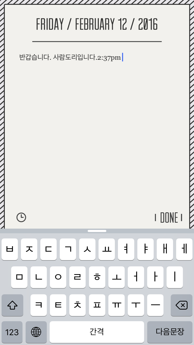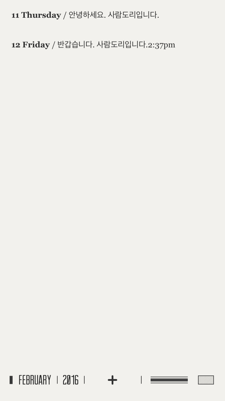 글쓰기(좌측 이미지) : 글을 잘 쓸 수 있다. 또 하나 특징은 타임스탬프 같은 기능으로 좌측 하단에 있는 시계 아이콘을 누르면 현재 시간이 바로 입력된다. 이 기능에서 차별화 포인트가 있는 거 같다. 언제 내가 무슨 생각을 했는지 현재 시각을 같이 입력하니 사용자의 감성을 자극한다.