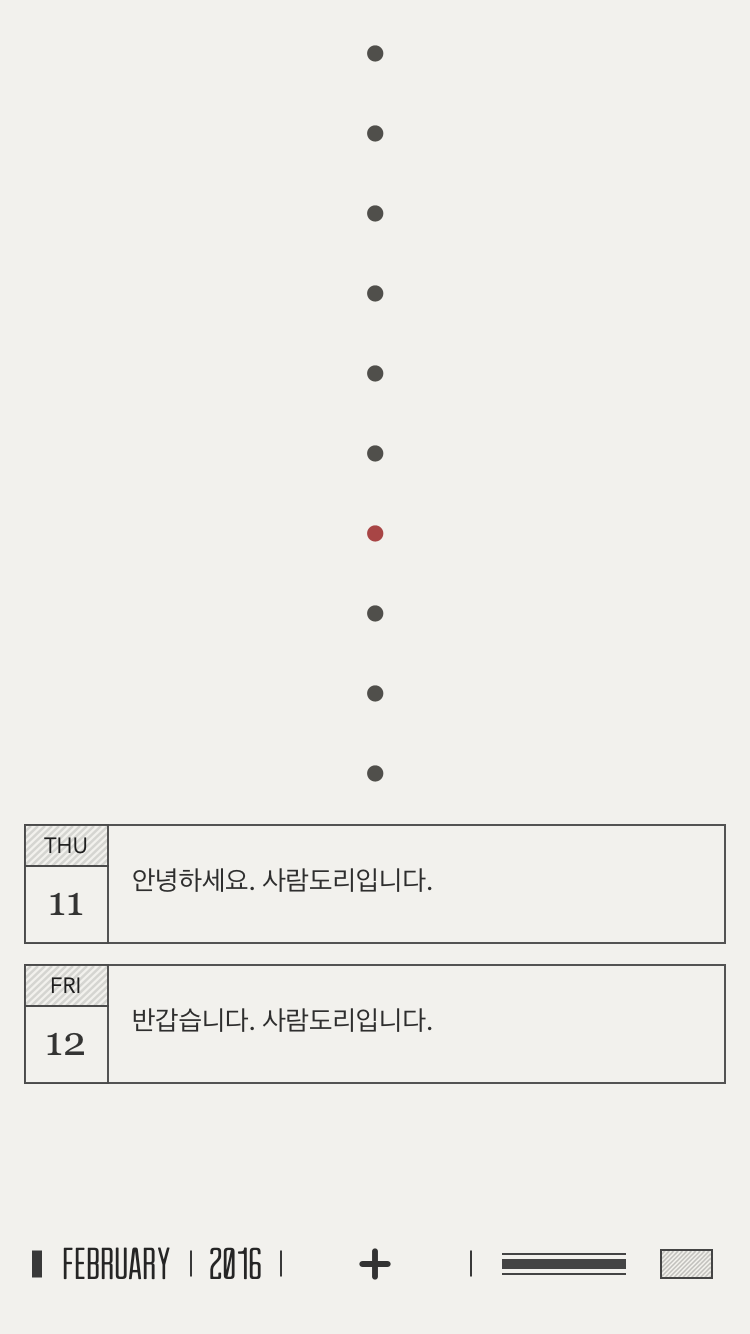 - 메인화면 : 가운데 원이 나열되어있고 글을 쓰면 해당 날짜가 적히면서 하단에 배치된다. 피드를 보는 구성은 위에서 보듯이 2가지다. 카드형, 텍스트형 . 이게 끝이다.. 정말 간단하다.. 허무할 정도로..