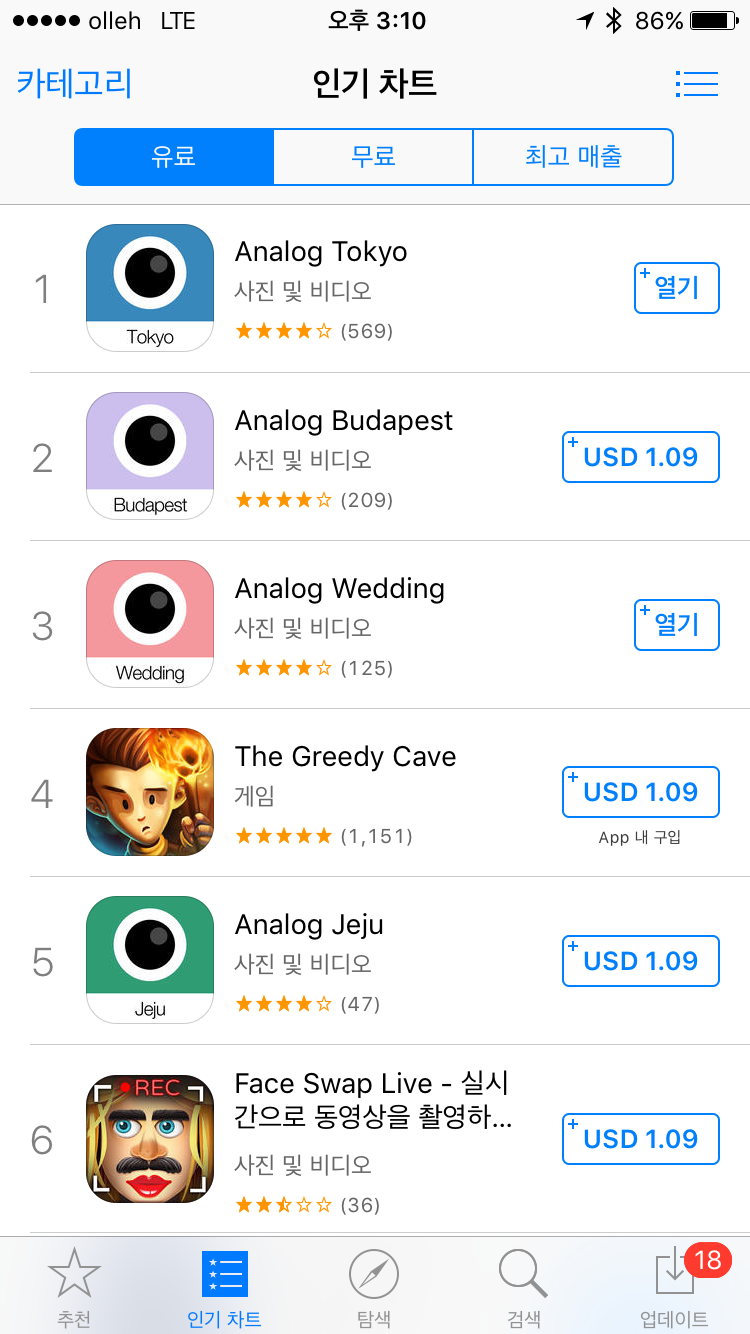 요즘 Top3 유료앱 순위를 휩쓸고 있는 Analog film을 보자 우선 이경우는 특이하다. 잘 된 디자인? 은 솔직히 말해서 아니다. 그렇다고 엄~~청나게 차별화된 필터? 흠 Analog film 시리즈 보다 더 이쁜 필터는 많다( 카메라360, 캔디 카메라, VSCO, B612)