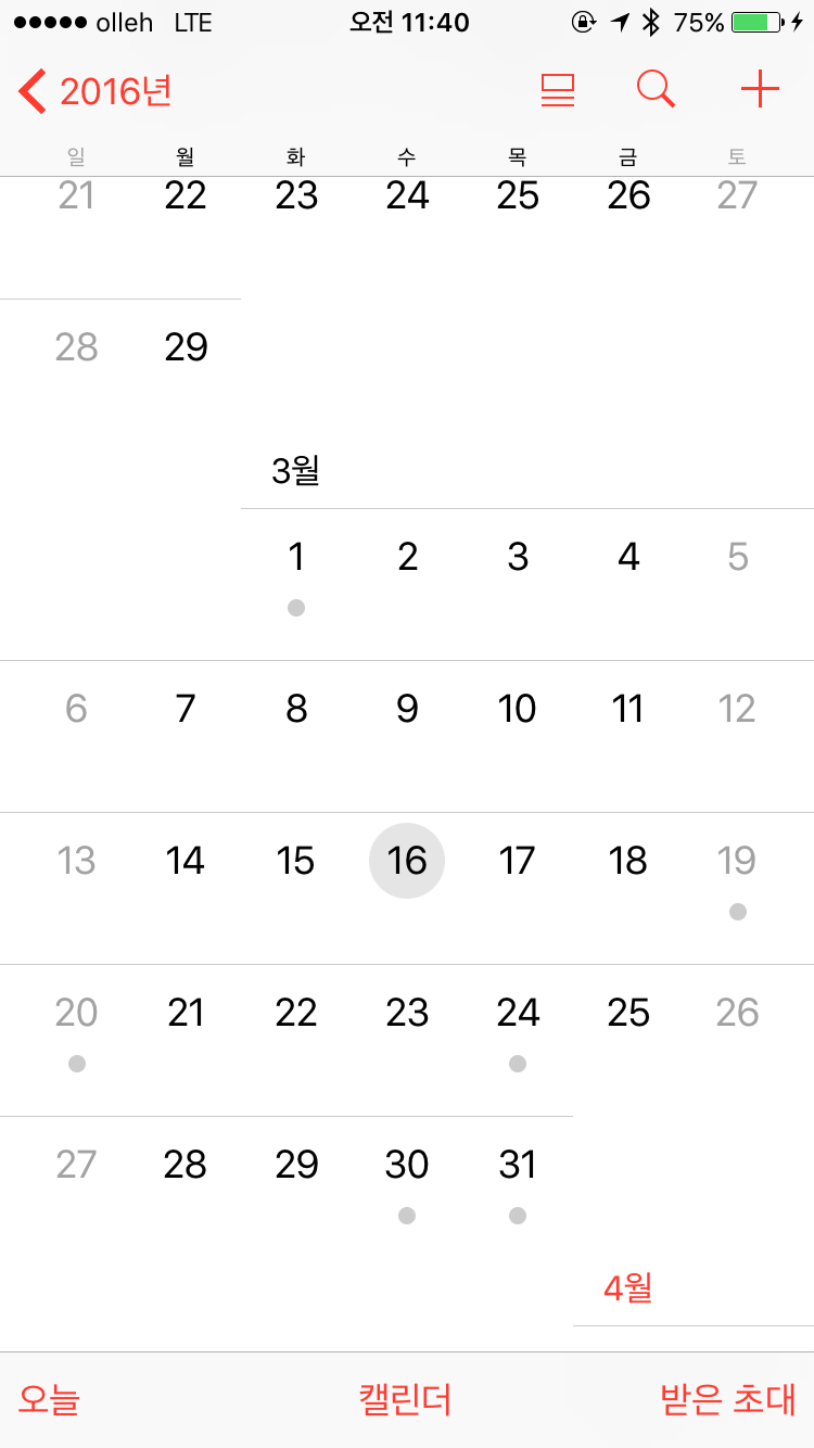 어떤 사람을 우측 상단에 있는 '+' 버튼을 누르고 일정을 선택할 수 있다. 그리고 나처럼 입력하고 싶은 특정 날을 선택하여 일정을 등록할 수 있다. 아아폰 캘린더는 후자의 상황에서 일정을 등록하기에는 정말 불편한 flow를 가지고 있다. 뷰마다 등록하는 flow의 차이가 있지만(나는 사실 뷰마다 flow가 다르다는 것도 납득이 어렵다) 좌측 화면을 보면 3월 '16일'을 누르면 3월 19일이 맨 위로 올라오게 된다. 그리고 우측 상단에 있는 '+'을 누르면 디폴트 날짜가 3월 19일로 되어있다. 내가 '16일'을 선택한 히스토리는 어디에도 남아있지 않다. 그리고 19일을 기준으로 일정이 등록될 거라고 누가 생각할 수 있을까? 만약 19일에 어떤 선택된 표시라도 있었다면 실수 없이 날짜를 수정했을 수 있다.