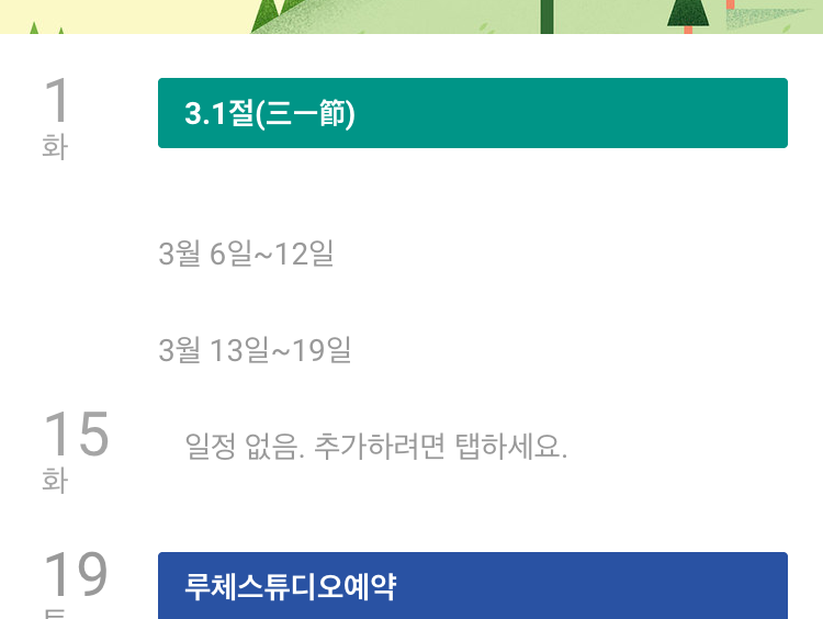 특정 날자를 선택하면 위와 같이 view 모드를 변경할 수 있다. 1 depth 뷰모드는 '월' 단위로 보는 방식에서 차이가 있었지만 2 depth는 어떤 기준으로 나눈지 알기 어렵다.