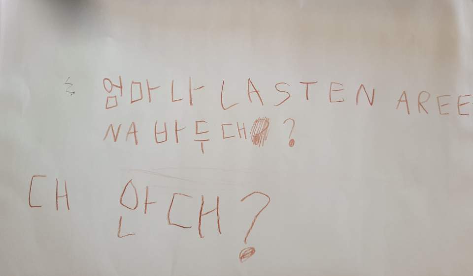 (이제 초등학교에 올라가는 만 7세 막내의 한글 수준 --;; 몇 주 전 비디오를 켜 놓고 콜을 하고 있으니 가까이 와서 방해는 못하고 나름 머리를 써서 봉투 위에 자기가 좋아하는 프로그램 봐도 되는지 허락을 받기 위해 이렇게 적어 러브 액츄얼리 식으로 엄마에게 보여주었다.)