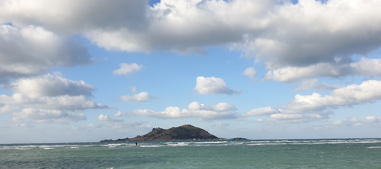 오늘도 잠시 머물고 지나가는 길이지만 참 아름답습니다. 맑은 하늘에 떠있는 뭉게 구름도 참 아름답고 하얀 거품을 일으키며 밀려오는 파도도 아름답게 느껴집니다. 그러나 이렇게 아름답게 보이는 바다지만 정작 현장은 휭휭 소리까지 들릴정도로 바람이 거세게 불고 있다는 것을 사람들은 알지 못할 것입니다.