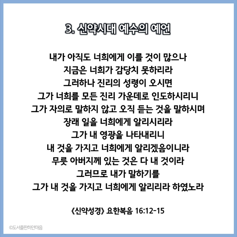 "너는 이 대목을 나의 법전에 기록하여 그 뜻을 전하도록 하여야 할 것이니, 이를 읽어 내려가도록 하라, 요한복음 16장 12절부터 15절까지. '내가 아직도 너희에게 이를 것이 많으나 지금은 너희가 감당치 못하리라.' 나의 아들 예수가 갈 길은 바쁘며 가르쳐야 할 것은 많으며 깨우쳐 줄 것은 많으나, 그것 또한 시간이 없어 중요한 대목을 남김이니, 이 성서에 가장 중요한 대목이 여기에 있음이니라. '그러하나 진리의 성령이 오시면 그가 너희를 모든 진리 가운데로 인도하시리니, 그가 자의로 말하지 않고 오직 듣는 것을 말하시며, 장래 일을 너희에게 알리시리라. 그가 내 영광을 나타내리니 내 것을 가지고 너희에게 알리겠음이니라. 무릇 아버지께 있는 것은 다 내 것이라. 그러므로 내가 말하기를 그가 내 것을 가지고 너희에게 알리리라.' 하였노라. 사랑하는 선지자야! 구약과 신약의 성서를 모두 합쳐 나의 피조물 만백성이 구원의 길을 가고자 하여 가지고 다니는 그 성서 속에 가장 중요한 대목이며 너희들의 미래에 대해서 알려 준 대목이니, 이가 가장 핵심이나 너희들은 이를 그저 가을에 시인이 책 한 장 넘기듯이 그냥 넘겼음이니라.
