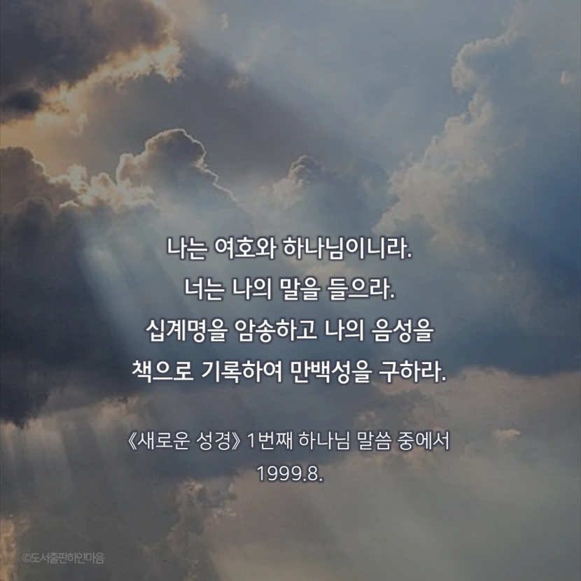 "나는 여호와 하나님이니라. 너는 나의 말을 들으라. 십계명을 암송하고 나의 음성을 책으로 기록하여 만백성을 구하라."