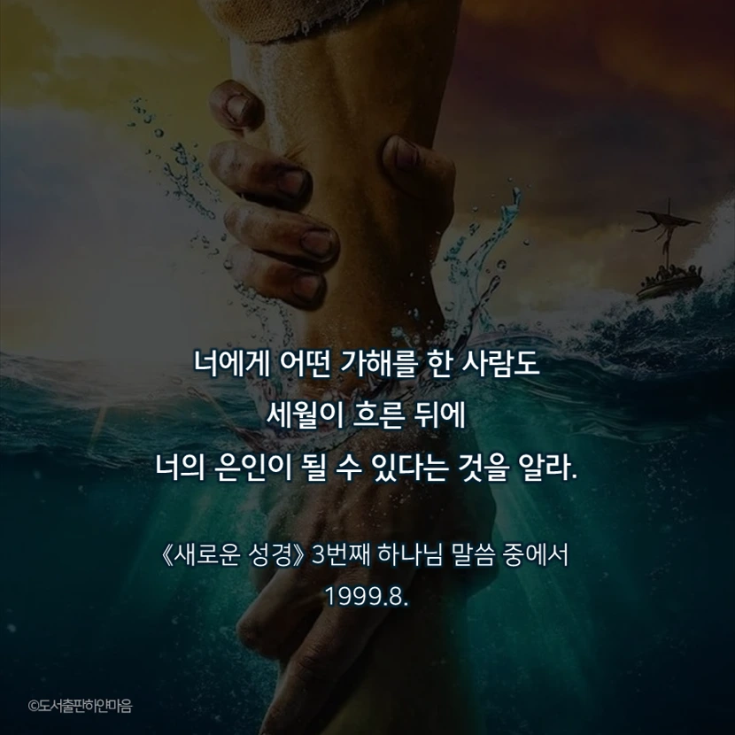 남이 너를 때렸을 때에는 반드시 그 이유가 있듯이, 너는 그 원인부터 생각하며 너를 때린 사람이 결국은 너에게 깨우침을 준 것이니, 바로 너의 스승임을 알아야 하느니라. 너에게 어떤 가해를 한 사람도 세월이 흐른 뒤에 너의 은인이 될 수 있다는 것을 알라. 지금의 변화만 가지고는 너희는 모르니, 그것은 나 여호와만이 알 수 있느니라.