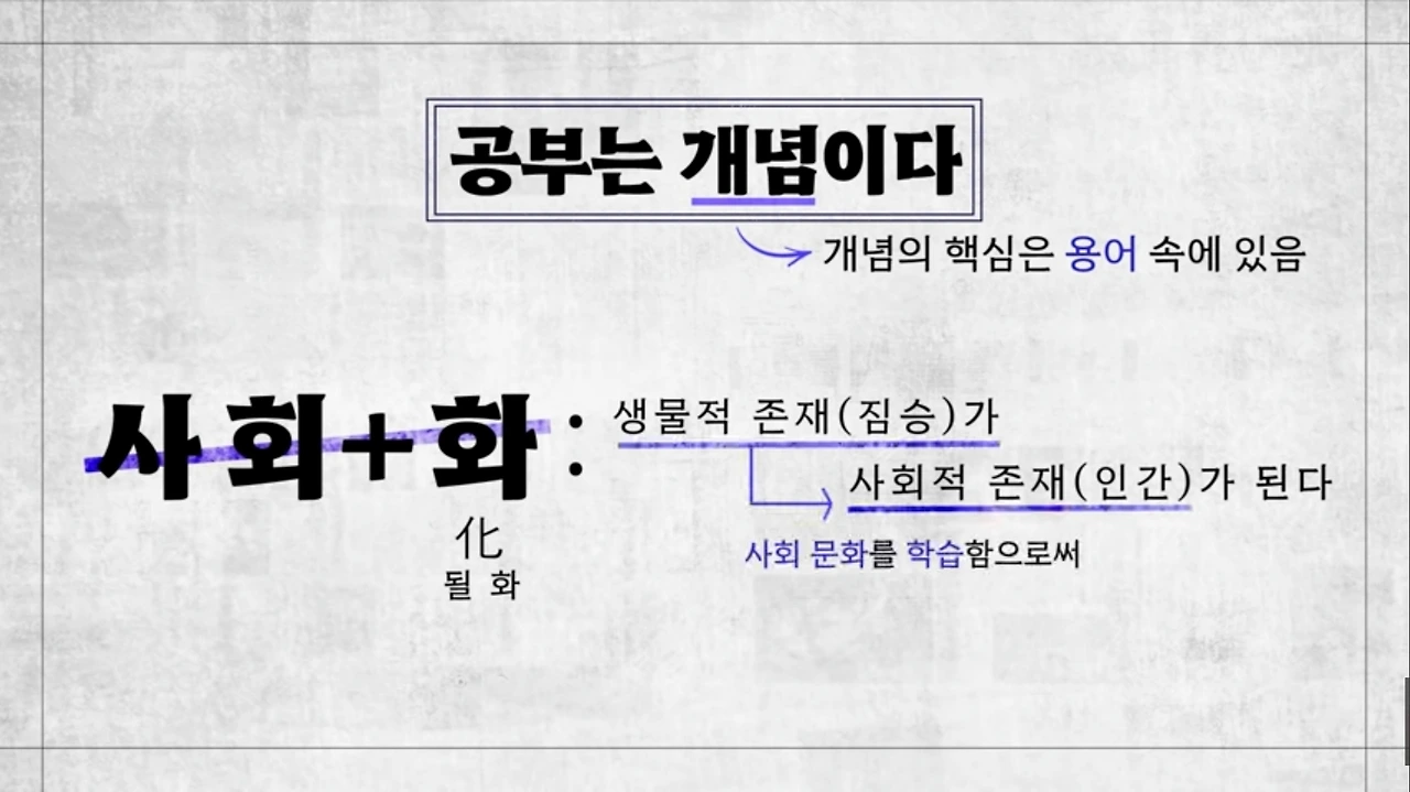 "사회화가 뭐냐. 예전에 한 20년 전에 내가 한창 설명하던 방식으로 설명해 볼게요. 사회화는 '사회+화'가 사회화야. 뭐지? 그럼 이 사회라는 거는 社會 요렇게 쓰는데 사회(社會) 화(化), 화는 뭐뭐 된다는 뜻이지. 그러면 사회적 존재가 된다는 뜻이야. 그런데 내가 고등학교 다닐 때 사회화 처음에 공부할 때 뭐라고 돼 있었냐면 '사회화란 한 사회 성원이 그 사회의 문화를 학습하는 과정'... 짜증 나잖아. 너무 길잖아. '한 사회 성원이 그 사회 문화를 학습하는 과정.' 이걸 진짜 한 열 번 써야 기억에 남잖아. 짜증 나잖아. 그래서 내가 가르칠 때는, 가만히 보니까 그게 아니야. 그냥 사회화는 사회+화 되는 거야. 이거 다시 말하면 뭐냐면, 인간은 처음 태어날 때 어떻게 태어나지? 애기가? 응애. 근데 그게 뭐하고 비슷해? (홍진경: 동물!) 그렇지, 거의 짐승하고 (비슷해.) 홍진경 씨가 딱 핵심을 잡네. 짐승하고 비슷해. 그런데 인간은 어떻게 돼? 인간이 되지? 그래서 이 짐승이 인간이 되는 과정이 사실은 사회화야. 짐승은 생물학적 존재지. 생물학적 존재로 태어나서 이게 시간이 지나서 사회적 존재가 되는 것이 이게 사회화야. 그러면 요렇게 되려고 하면 뭐가 필요하지? 짐승이 안 하는 거. 우리 하나 하는 거 있잖아. (홍진경: 학습!) 사람이 학습을 통해서 인간이 되는 게 사회화야. 그래서 사회+화, 사회적 존재가 된다. 이게 사회화야, 별 게 아니야. 그러면 이 학습의 내용이 뭐냐. 이 학습의 내용이 결국 문화야. 이게 사회화야."