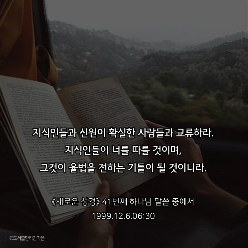 미래를 보고 나의 법전을 전하라. 나의 법전은 장사가 아니니라. 그리고 수입을 올리기 위한 장사의 수완으로써 나의 법전을 내보내는 것이 아니니라. 그저 전하면서 나의 백성이 깨우쳐 하늘에 오르는 길을 가르치기 위함이니, 그저 전하는 방법을 연구하여 젊은 세대들과 어린 새싹들이 나의 법전을 읽을 수 있도록 그들에게 전하는 방법을 강구하여야 될 것이니라. 그리하여 그들의 학원에, 배움의 터전에, 그들이 접할 수 있는 곳에 나의 법전이 꽂혀 있고 쌓여 있어야 할 것이니, 그와 같이 나의 법전을 전하는 자가 있을 것이니라.