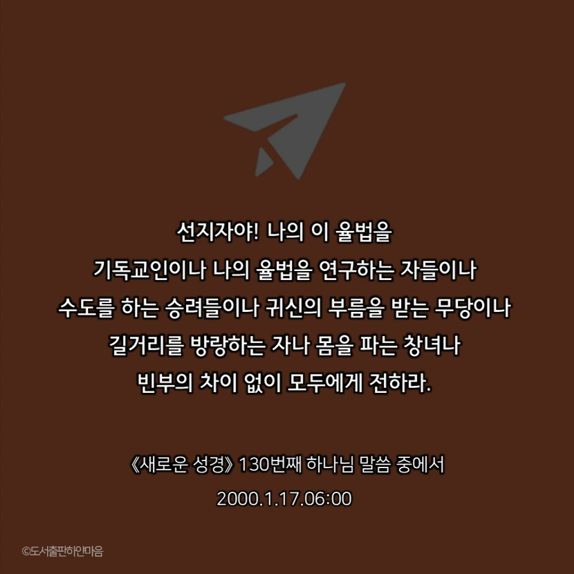나의 법전을 세상에 내려보내는 것은 그와 같이 우상과 저희들의 영혼을, 저희들의 육신의 어떤 안일을 위하여 모든 의식을 갖추고 행하는 그들까지도, 너희들이 말하는 지식인의 세계와 미개인의 세계에 있는 나의 피조물들도 다 똑같이 나의 법전을 읽어 그들이 진정 내가 존재함을 깨우쳐 그들에게도 구원의 기회를 주고자 함이 나의 뜻이니, 너는 모든 네 위치에 있는, 네 주변에 있는, 너희들의 생활권에 있는 그곳에서 나의 법전을 전함을 생각하지 말며 온 세상에 나의 법전을 전하는 것을 항상 염두에 두며 생각하고 행동해야 할 것이니라.