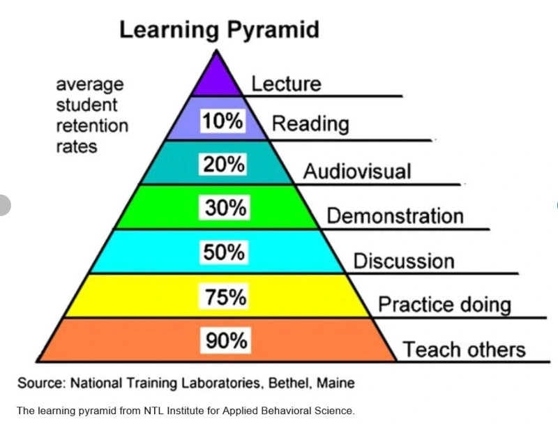 미국 행동과학연구소에서는 학습 방법에 따라 학습 24시간 뒤에 기억에 남는 효과를 연구했는데, 그 결과를 그림으로 나타낸 것이 '학습 피라미드'다.