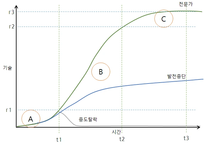 배우고 익히는 학습의 변화를 시간에 따라 도식화한 것을 '학습곡선'이라 한다. X축이 시간 축이고 Y축이 기술 축이며, 중도탈락자, 발전중단자, 전문가라는 세 가지 학습자의 학습곡선이 도식화되어 있다. 학습을 하다가 만 사람은 중도탈락자가 된다. 시간이 지나도 그 분야에 대해 학습을 계속하지 않은 사람은 발전이 중단돼 전문가가 되지 못한다. 반면에 시간이 갈수록 깊이 파고든 사람은 전문가가 된다.
