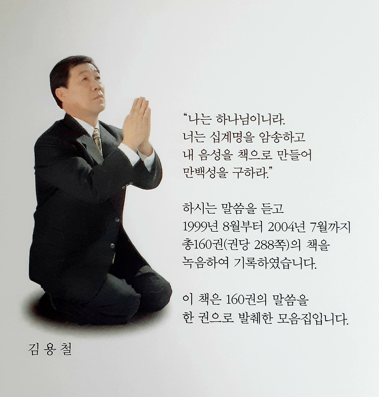 1999년 8월 하나님께서 대역자인 김용철 선지자에게 "나는 여호와 하나님이니라. 너는 나의 말을 들으라. 십계명을 암송하고 나의 음성을 책으로 기록하여 만백성을 구하라."는 말씀을 내리고 나서부터 시작된 '심판의 시대'를 역사하는 중에, 김용철 선지자도 화평이 아니라 검을 받음으로써 가족의 반대와 갈등이 있었던 것으로 추정되는 내용을 법전에서 읽을 수 있으며 오프더레코드(off the record)로 전해지는 사연도 들을 수 있다. 그런 선지자에게 하나님께서는 모두를 대중적으로 보라는 다음과 같은 말씀을 전해 주셨다.