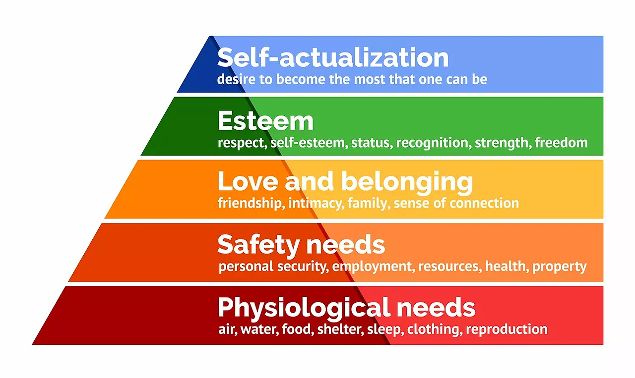 ⑤ 존중 : 매슬로는 2가지 범주로 분류했다. (ⅰ) 자신에 대한 존중 (자존감, 성취, 숙달(mastery), 자립) (ⅱ) 타인에게 인정받고 소중히 여겨지는 욕구 (예컨대 지위, 명망)
