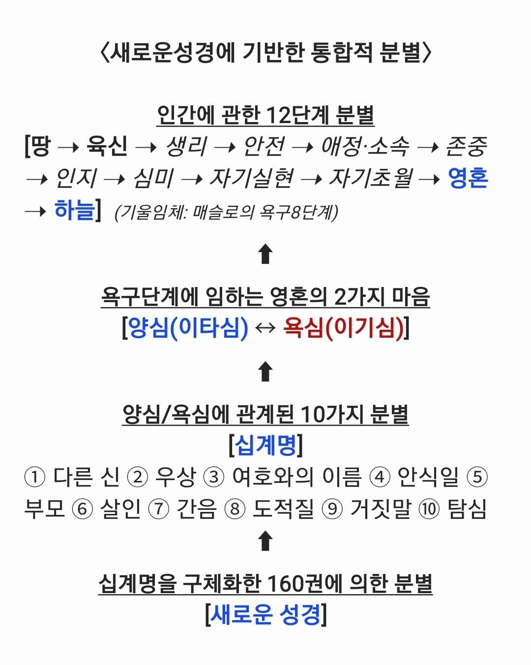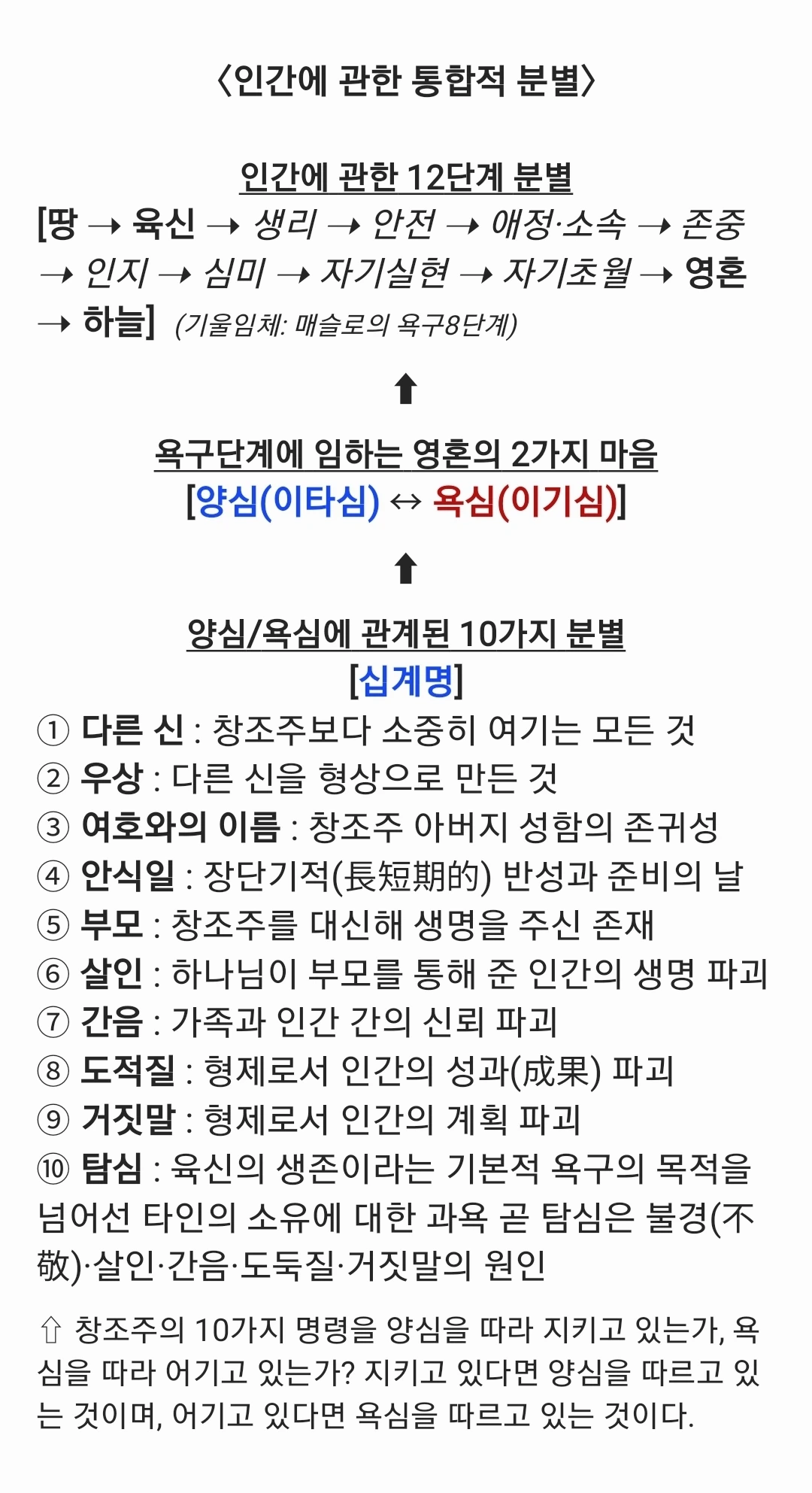 이제, 십계명이라는 10가지 기준을 접목하여 인간에 관해 다음과 같이 통합적으로 분별할 수 있다. 십계명을 암송한 후 <인간에 관한 통합적 분별>을 암기한다면, 나 그리고 나와 상대적 관계를 맺고 있는 사람들이 어디에 존재하고 있는지, 영혼의 어떤 마음으로 살아가고 있는지 분별할 수 있다.