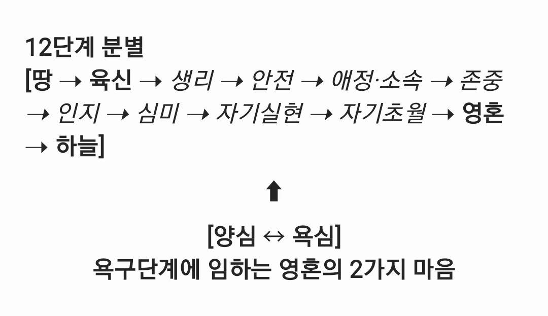 이제, 두 가지 영혼의 마음의 작용을 이해하면서 12단계 분별 기준을 새롭게 바라볼 수 있다. 자신을 포함해 사람들이 각 단계의 욕구를 동시다발적으로 충족시키면서 그것에 욕심으로 임하고 있는지, 양심으로 임하고 있는지 분별할 수 있다.