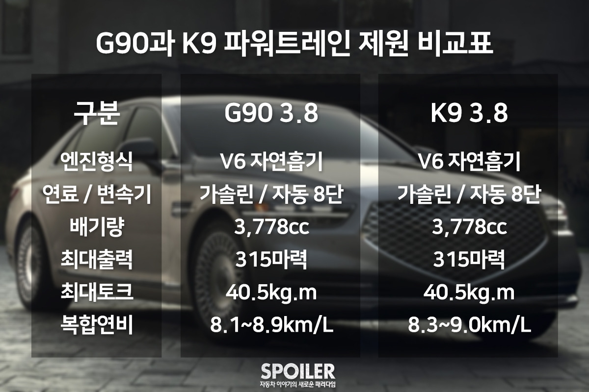 K9은 페이스리프트 되면서 파워 트레인에 변화를 주지 않았다. 최근 그랜저, K7, 싼타페 등 다른 페이스리프트 모델들이 보여준 행보와 조금 다르다. 이 때문에 G90과 동일한 엔진과 변속기를 장착한다. 배기량, 출력, 토크 등 모든 수치가 동일하며, 공인 복합연비만 8.3km/L~9.0km/L로 차이를 보인다.