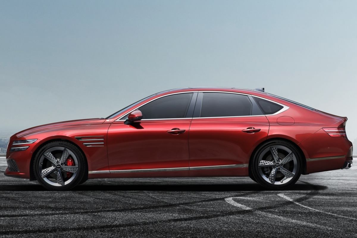 측면부에도 다크 유광 크롬이 적극적으로 사용되었다. 사이드 몰딩과 지 매트릭스 패턴의 스포츠 전용 20인치 다크 스퍼터링 알로이 휠, 그리고 엔진 사양에 따라 달리 적용되는 레드 혹은 블랙 색상의 캘리퍼가 G80 스포츠만의 특징을 살리고 있다.