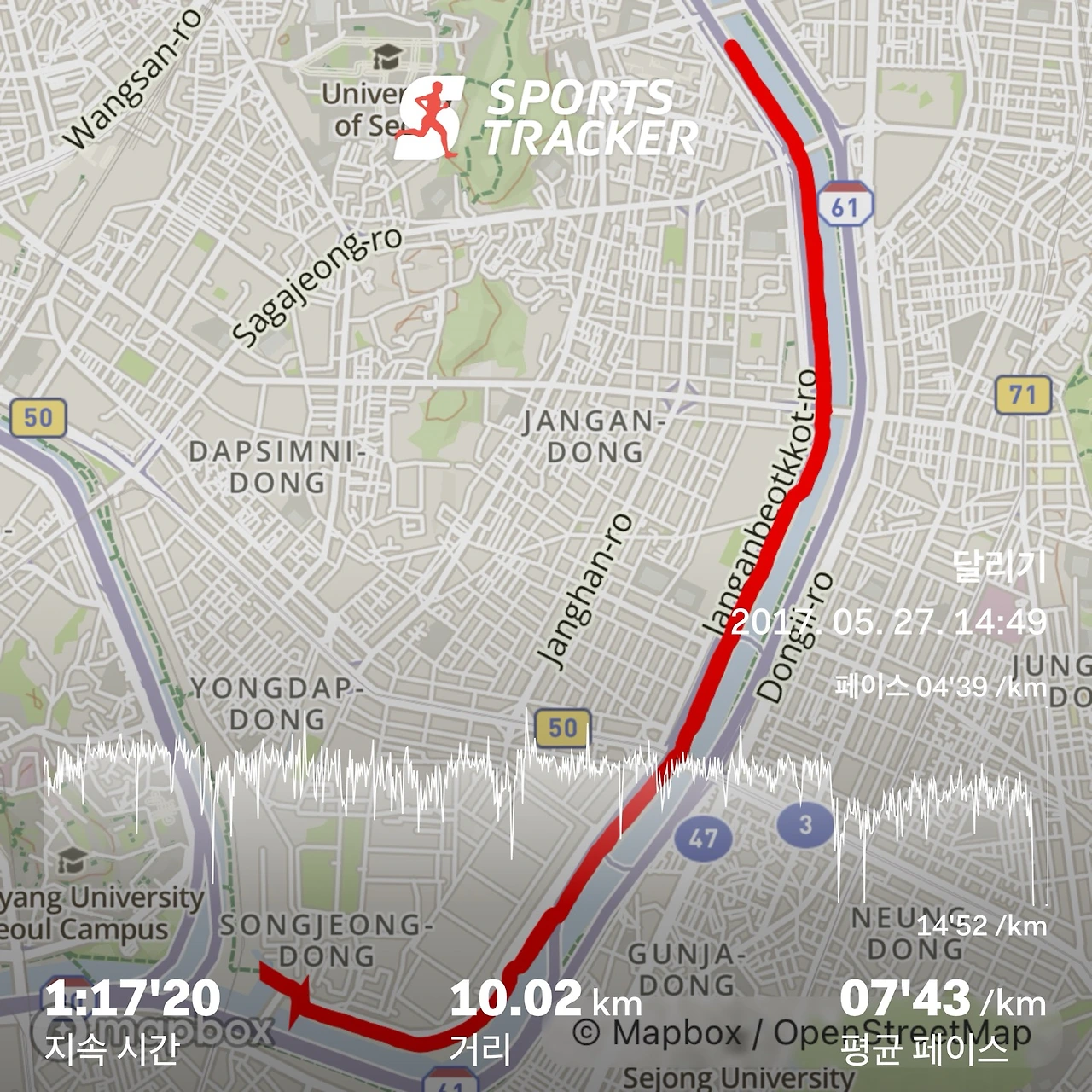 이틀 전에 편하게 걷고 하루 쉰 다음 처음으로 온전히 뛰어서 10km를 완주했다. 드디어 뛰기로 작정하고 나섰다. 평소 걸어서 다녔던 코스라 익숙한 코스. 집 앞에서 출발하여 마장동 한양대 뒤편까지 중랑천변 코스로 편도 5km를 왕복하면 10km, 걸어서는 2시간이 걸린다.