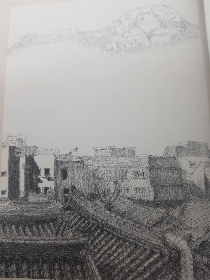 나무가 보여서 그리기 시작했고, 건물 옥상에서 바라본 풍경 속에 오래 머물러 그 시간을 그림 속에 담았다,