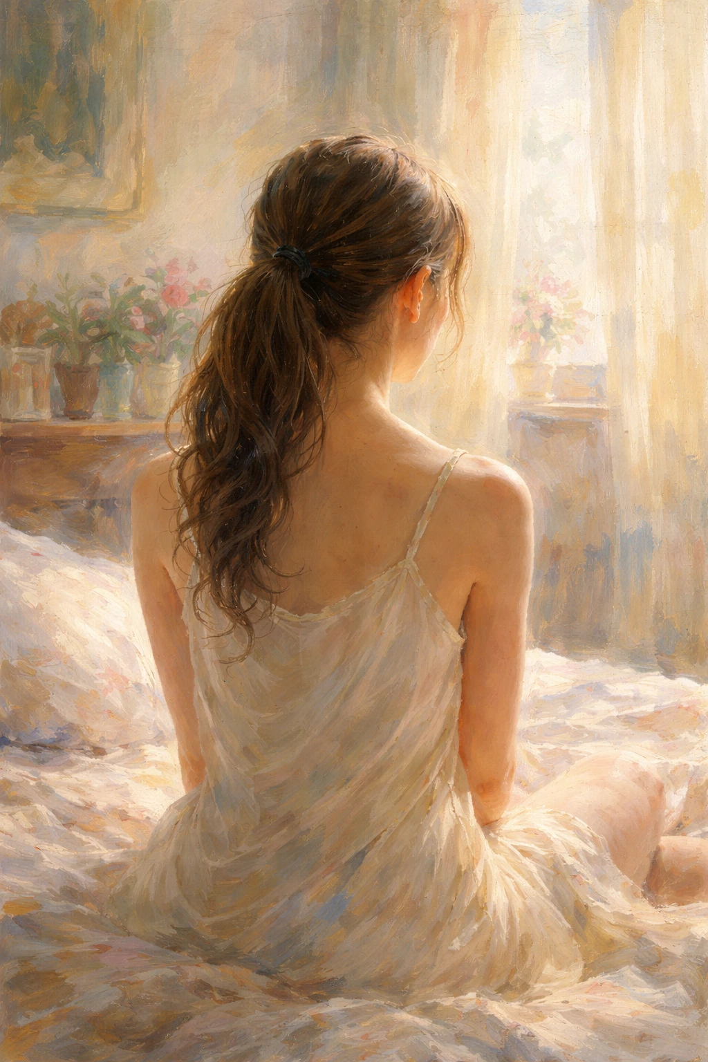 그녀가 방안에 뒷모습을 보이며 앉아 있다. 굴곡진 그녀의 허리에서 뻗어 나온 두 갈래의 부드러운 등선이 잔털이 난 가녀린 목덜미를 지나 말끔히 땋아 올린 포니테일 머리까지 이어졌다. 오른쪽 귀 뒤에는 작은 점이 하나 보인다.