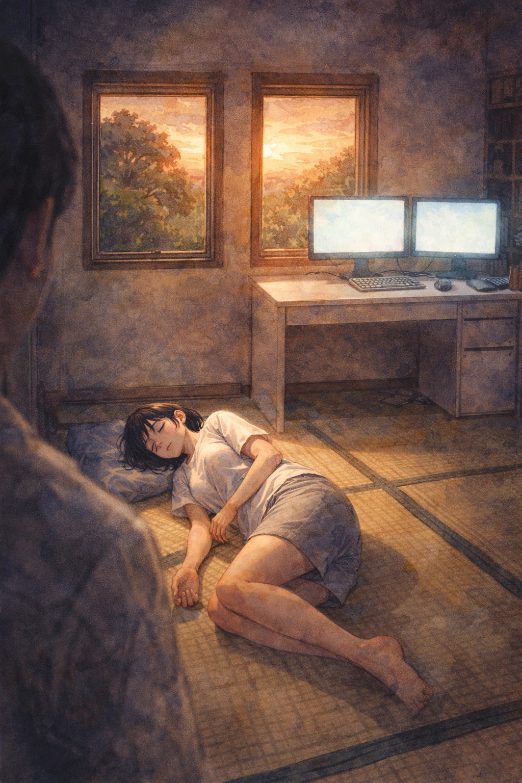 집 안 내부에 대자리가 깔려 있다. 작은 창문 두 개가 딸려 있고 하얀색 책상이 창밖을 바라보게 놓여있는 방. 책상 위로 컴퓨터 스크린 두 대가 나란히 켜져 있다. 방 안에는 거울과 시계 그 어느 것도 없다.