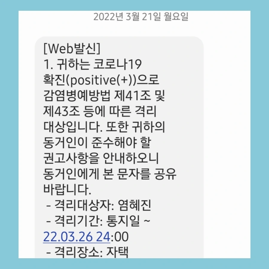 아이들 학교와 어린이집에 간 후 확진 문자를 받았다. 문자와 함께 나는 확진자가 되었다.