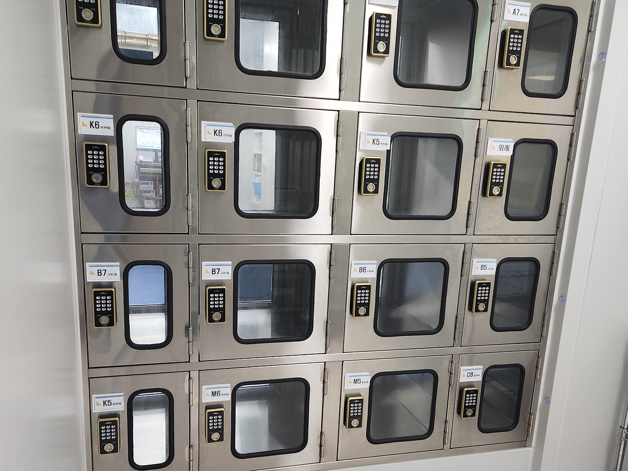 약만 드나드는 패스 박스(사진에 도어록이 달려있는 칸 하나하나)라는 비좁은 곳 안으로 몸을 밀어 넣어 들어갔고, 안쪽에서 문을 열고 나왔다.