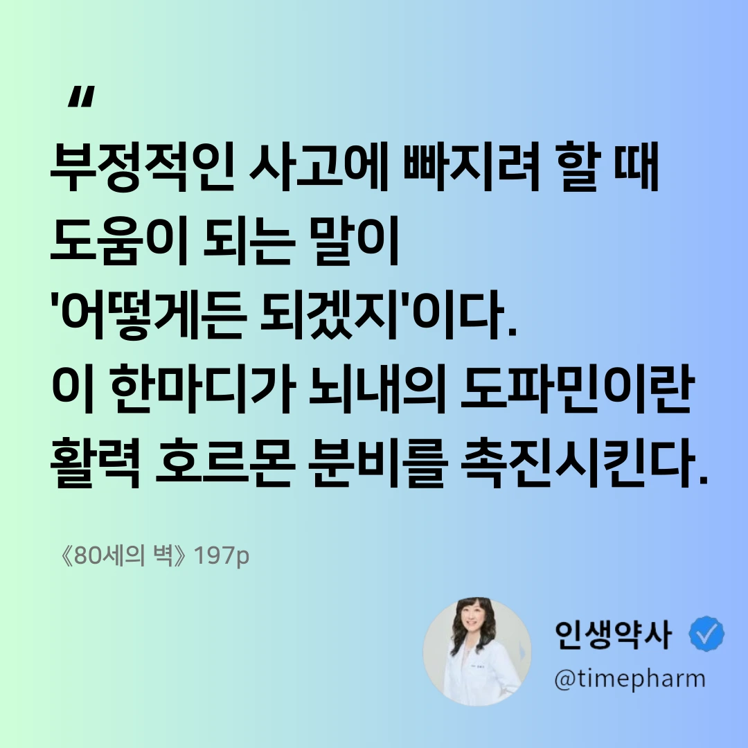 도파민의 가장 중요한 임무가 동기부여란 말이 있는데, 우리 스스로 어떻게든 될 거니까 걱정말자는 편안한 태도로 스스로 동기를 부여 한다면 부정적인 생각은 저 멀리멀리 던져버릴 수 있으리라.