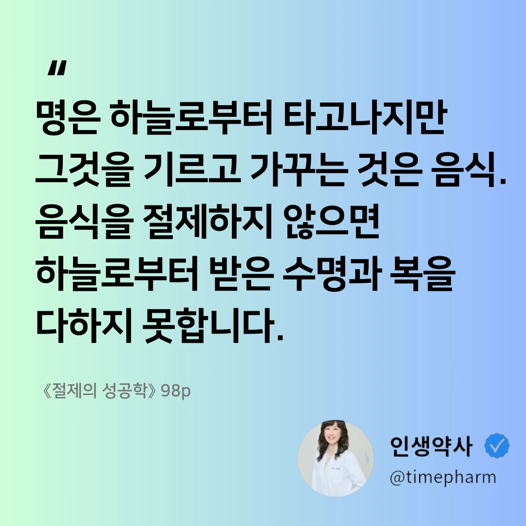 복만큼의 음식을 먹고 산단다. 어른들이 자기 먹을 복은 타고난다는 말이 바로 이 말이다. 그런데 하늘로부터 받은 명을 기르고 가꾸려면 음식을 절제해야 한다. 음식 절제가 안되면 수명과 복을 다 하지 못해 단명할 수 있다.