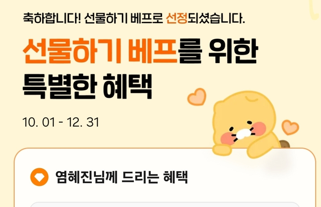 카카오톡에서 선물하기 VIP 베타버전 테스트 후 선물하기 베프란걸 만들었는데 거의 1년 내내 선물하기 베프로 선정되었다.