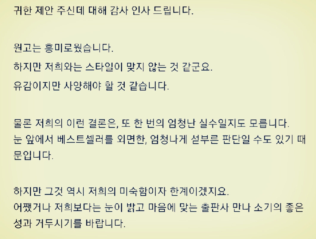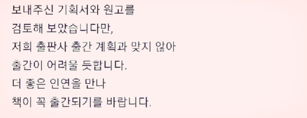 나에게 맞는 출판사는 반드시 있습니다. 저런 거절 메일 100통을 받아도 한 명만 오케이 하면 되는 것임 ^^