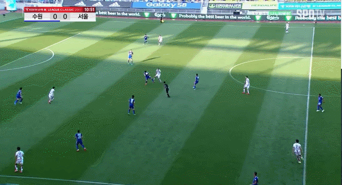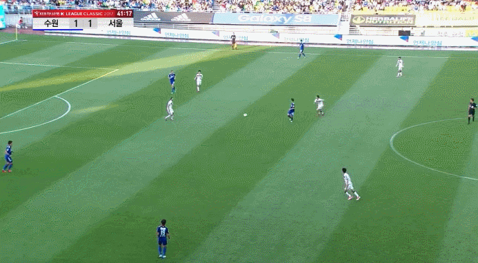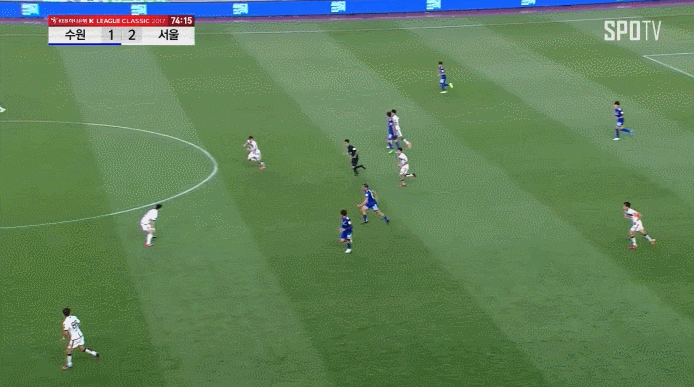 우선 수비 상황에서 풀백과 센터백 사이에 공간이 발생했다. 경기 초반 수원의 중원 장악력이 우세한 상황에서 수원의 윙백 장호익과 고승범은 최대한 넓게 형태를 잡고 높게 전진했다. 그러다 보니 서울의 풀백 김치우와 이규로의 수비 형태 역시 넓어졌는데 그 공간을 수원의 공격진이 잘 활용했다.