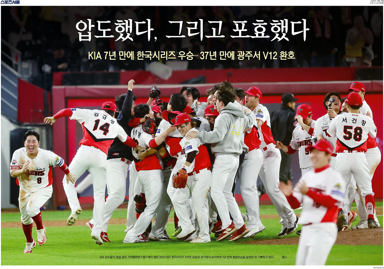 스포츠서울은 한국시리즈 우승이라는 이슈에 대해 다른 신문사보다 그 동안의 DB를 적극 활용한 점이 눈에 띄었다. 스포츠 전문 매체답게 기아 타이거즈의 전신인 해태 시절부터 우승했을 때의 1면을 모두 기사에 녹였다. 경기 상보와 인터뷰 등은 온라인으로 최대한 독자들에게 소비시키고, 지면에는 보다 정제된 데이터만 녹인 것이다.