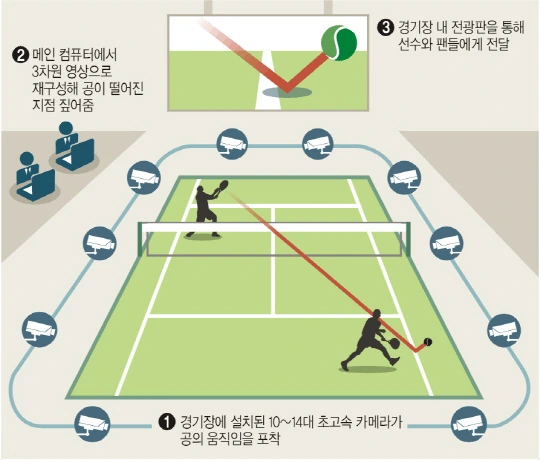 테니스 비디오 판독은 호크아이(HAWK-EYE)라 부른다. '매의 눈'이다. 2006년 US오픈(테니스)에서 처음 도입되었다. 호크아이로 판독을 요구하는 것을 테니스 용어로 챌린지라고 부르는데 실제 챌린지 시 매소리가 경기장에 들리기도 한다. 챌린지는 세트당 3회로 제한되어 있다. 테니스에서 챌린지 시 주목할 만한 점은 챌린지 시 일정한 간격으로 들리는 관중들의 박수소리다. 코트 곳곳에 설치된 10대의 초고속 카메라가 공의 궤적을 촬영하고 이를 3차원으로 보여준다.
