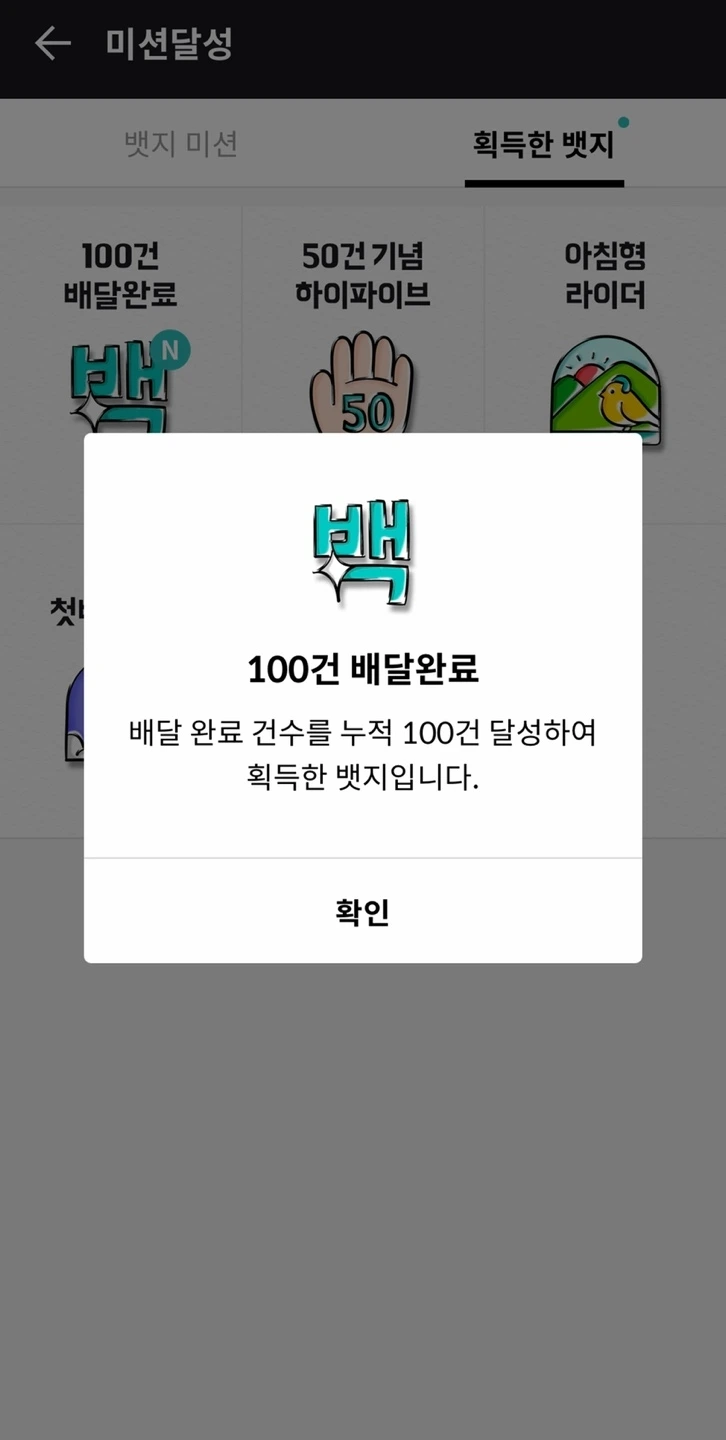 무엇이 내가 배민커넥트를 계속 하게 만들었는지는 잘 모르겠다. 여튼 내 배민커넥트 배달은 계속되었고, 이제 100건 배달을 완료하고 뱃지도 획득했다.