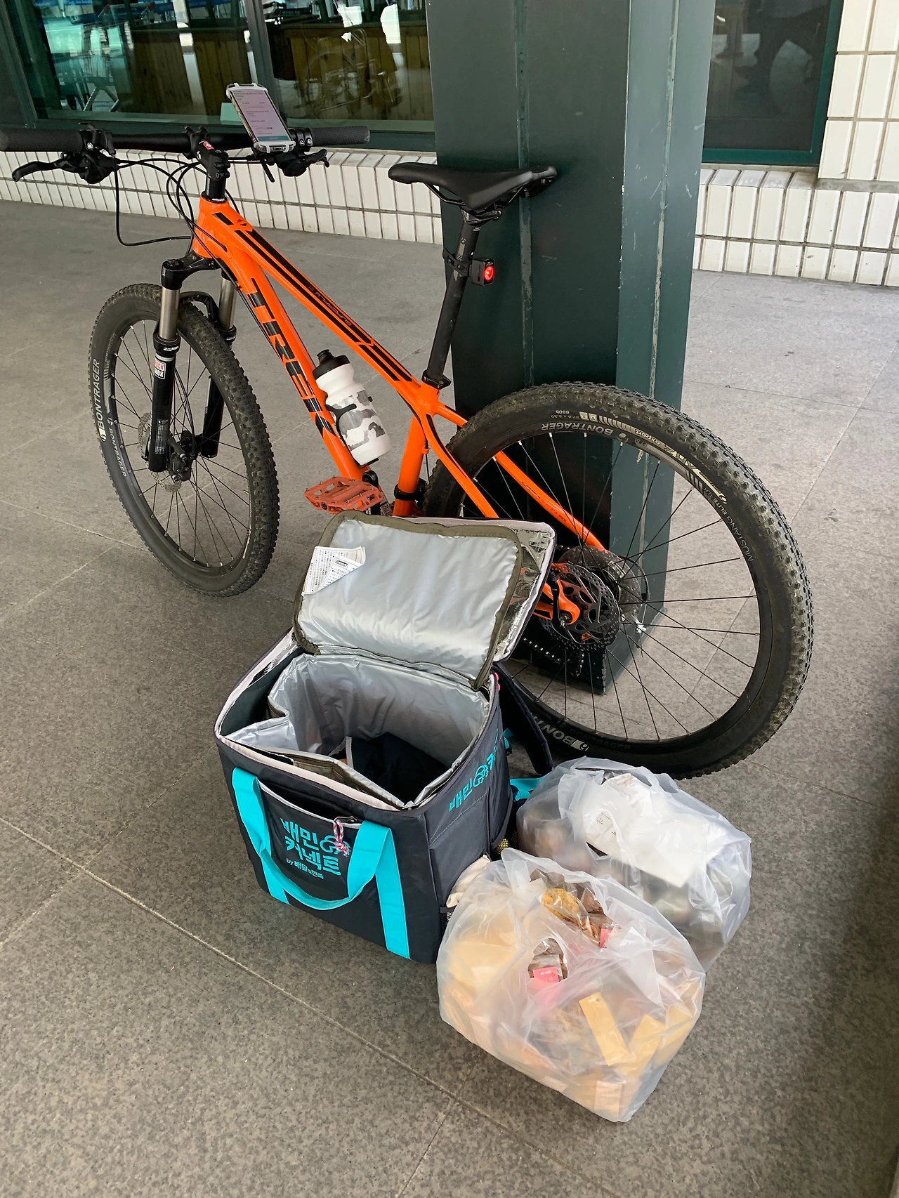 나는 평소에 배달 음식을 즐기기는 않아서, '배달의 민족' 앱을 설치하고, '배민커넥터' 모집 배너를 눌렀다. 나는 어떤 사람, 어떤 배달 수단을 사용할 것인지 등을 차례대로 입력하고, 접수를 완료했다. 접수 완료가 되니 안전교육 영상을 볼 수 있는 링크가 왔고, 이 링크에 따라서 착실하게 영상을 봤다. 온라인 교육의 마지막은 늘 온라인 시험인데, 기분좋게 온라인 시험도 합격(물론 시험문제가 상식적이라서 떨어지기는 어렵다). 배민커넥트 때문에 큰 투자를 하지는 않았다. 외국계 자전거 회사도 1년간 다닌 적이 있어서, 쓸만한 자전거는 가지고 있었다. '배민커넥터'는 배달 가방을 매고 자전거를 타야하기 때문에 배달 가방이 한 쪽으로 쏠리지 않게 하려면, 내 취향과 무관하게 허리를 세우고 라이딩을 하는 MTB(라이딩을 할 산이 근처에 없어서, 산악자전거라고 하기에는 다소 애매)를 배달 수단으로 선택해야만 했다. 초기 투자는 바로 '배달 가방'과 자전거용 스마트폰 거치대였다.