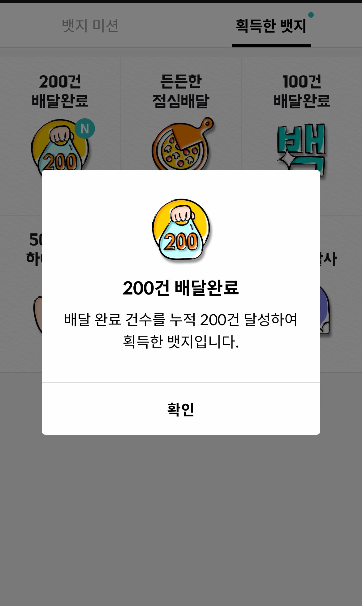 배달을 마치고 배민커넥트앱에서 이것저것을 눌러보다가 새로운 뱃지를 발견했다. ‘200건 배달완료’ 뱃지였다. 하지만, 오늘 배달을 하면서 가장 기억에 남은 것은 점심시간에 집 근처에서 배달을 하고 있을 때, 어린이집에서 근처 놀이터로 나와서 놀고 있던 우리 아들 목소리였다. 참 그 목소리를 분간해서 듣는 나도 신기하다고 생각을 했다. 우리 아들은 세상 유쾌하게 웃으면서 미끄럼틀 근처를 뱅글뱅글 돌고 있었고, 친구들 몇 명이 그 뒤를 따르고 있었다. 별 것이 아니지만, 그 평온한 모습이 참 큰 힘이 된 하루였다.