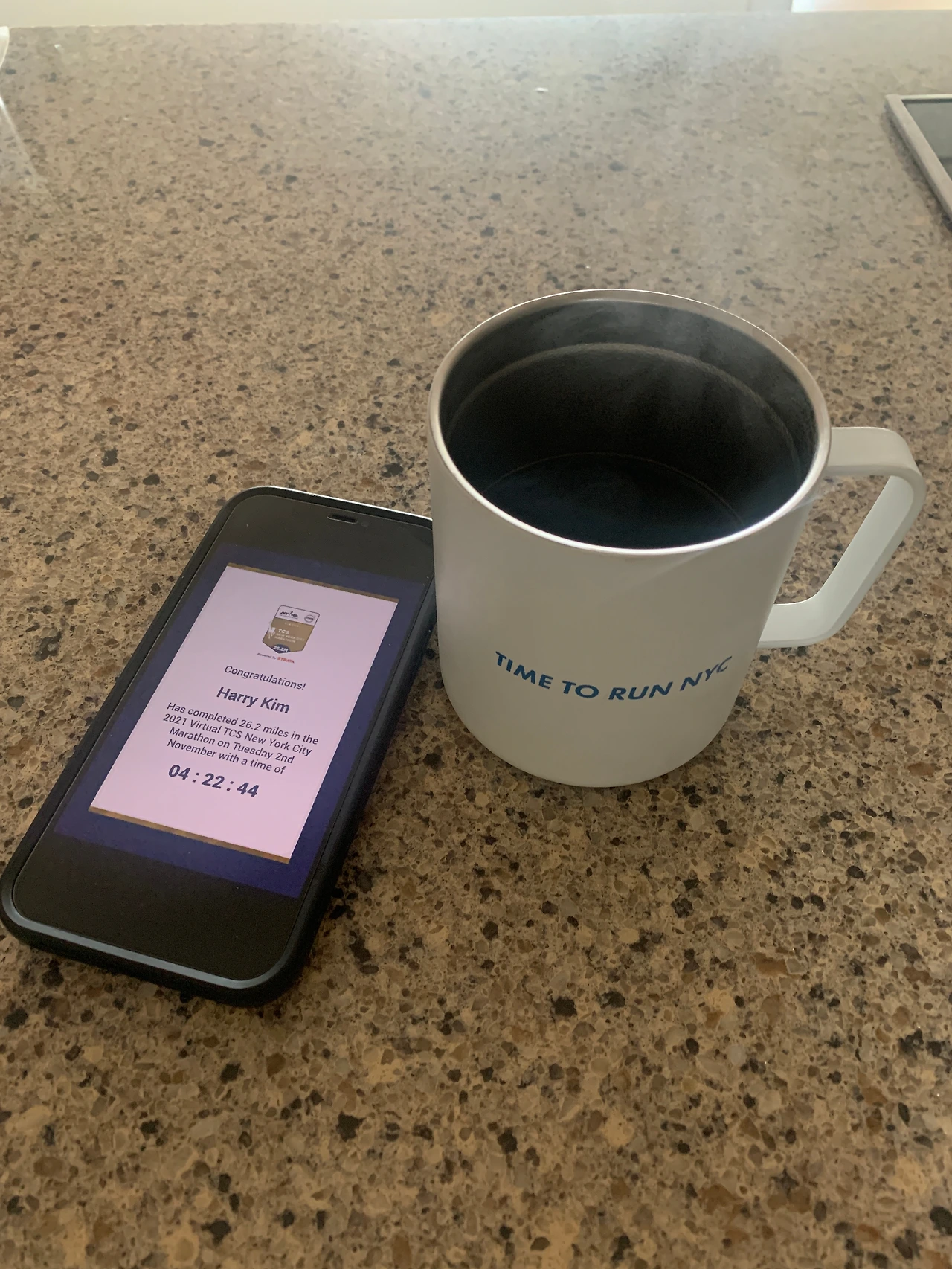 아침 5시에 일어나서 화장실에 두 번 가고, 에너지젤 2개를 먹었다. 그리고 주섬주섬 달릴 때 입을 옷과 러닝화를 준비했다. 하의는 짧은 레이스용 5인치 길이 쇼트(short)을 상의는 아침이면 쌀쌀할 것 같아서 긴 팔 러닝용 티셔츠를 챙겼다. 버츄얼 레이스의 기록 측정은 챔피언칩으로 대표되는 기록칩이 아니라 내 스마트폰으로 해야 한다. 늘 사용하던 트레일 러닝용 벨트에 에너지젤 1개도 넣었다. 양말은 긴 나이키 컴프레션 삭스를 신었다. 러닝화는 고민을 하던 차에 부엌에 있는 ‘Time to run NYC’라는 프린트가 된 호카(HOKA) 머그컵이 보여서 호카 카본X2를 신었다. 집 앞 횡단보도를 지나서 뉴욕마라톤 앱과 가민945 GPS 시계로 기록 측정을 시작했다. 생각보다 날씨는 딱 달리기가 좋았다. 마스크를 했기 때문에 코로만 호흡을 하는 것은 무리라고 생각하고 초반 페이스(pace)를 1km에 5분에 달리는 것으로 하려고 노력했다. 한 10km를 달릴 때까지는 즐거웠다. 계획한 5분 페이스로 거의 정확하게 달리고 있었다. 하지만 15km 지점에서 멈추고 말았다. 이건 성가신 정도가 아니고 오른쪽 발바닥 중간 쯤에 물집이 생긴 것이 확실했다. 다만 이 물집은 아직 터뜨릴 단계가 아니고, 점점 커지면서 나를 괴롭힐 것이 확실했다. 풀코스 마라톤을 달리면서 러닝화에 돌이 들어간 적은 있었지만, 물집 때문에 멈추게 된 것은 처음이었다. 보통 풀코스 마라톤의 고통은 30km 정도부터 시작되어야 하는데, 고통의 시간이 너무 빨리 시작되었다. 뉴욕마라톤 앱에서는 5마일(mile)마다 음성 코칭도 나오고, 참가자들의 즐거운 인터뷰도 있었지만 이런 목소리들은 전혀 도움이 되지 않았다.